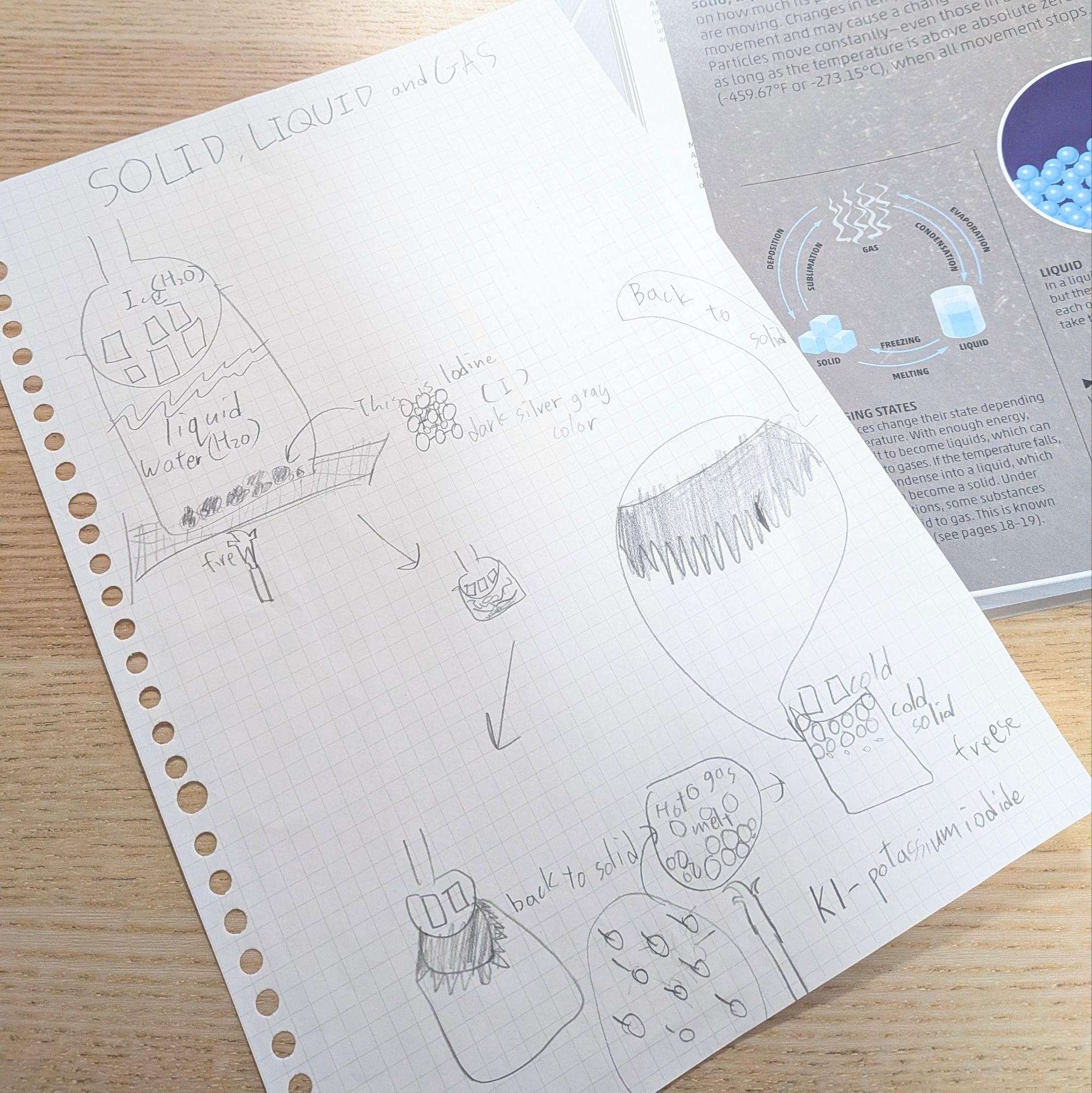 ページの隙間から、息子が描いた“固体・液体・気体”のメモが出てきて、思わず笑ってしまったほど読み込んでいます。
