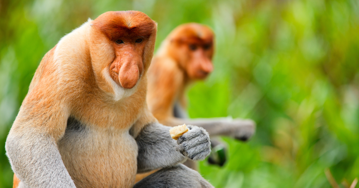 ボートに乗ってマングローブの森を進むと、木の上にユニークな顔のテングザル(Proboscis Monkey)の群れが!
