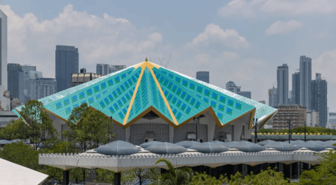 一般的なモスクの丸いドームとは異なり、青みがかった16角形の傘型の屋根が特徴の国立モスク Masjid Negara(マスジッド・ネガラ)