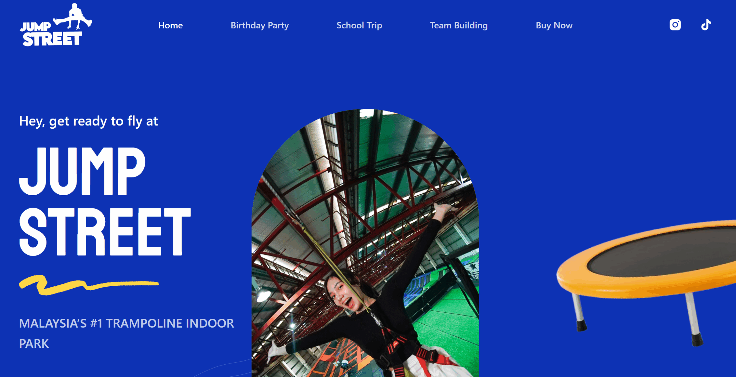 床から壁まで繋がるトランポリンのネットワークで、安全に高く跳ねられます。
