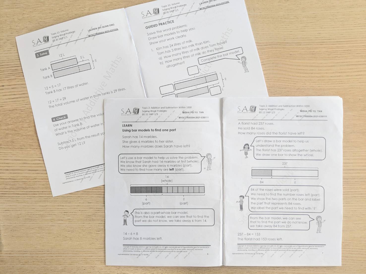 とくに「モデル図(bar model)」は、今でも難しい問題の時に思い出して使っているほど、息子の中にしっかり根付いています。通っていた教室では、プリント形式でステップアップしていくオリジナル教材を使用。